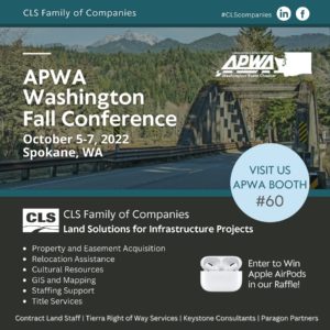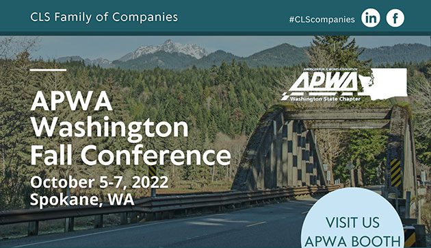 The CLS Family of Companies is attending the American Public Works Association (APWA) Washington Fall Conference on October 5-7, 2022 in Spokane, Washington. We look forward to connecting with Public Works professionals and engineering partners at this event.