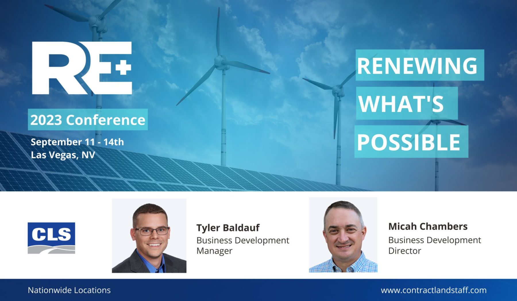 Join us at RE+ 2023 in Las Vegas on September 11-14 for the largest clean energy event in North America. Connect with our team members Tyler Baldauf and Micah Chambers to learn how we help renewable energy clients capture the land resources needed to power the country. To request more information or set up a meeting, email info@contractlandstaff.com